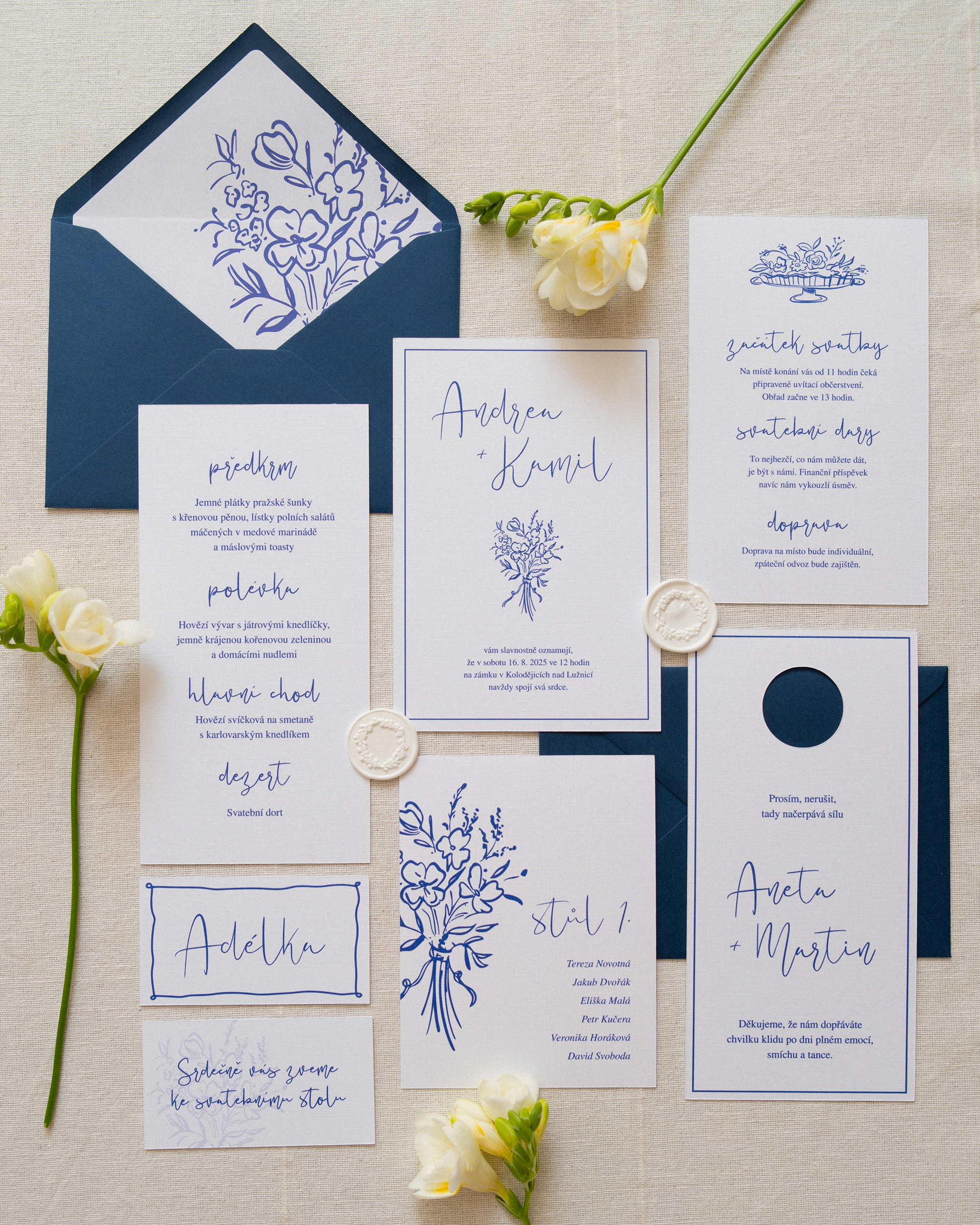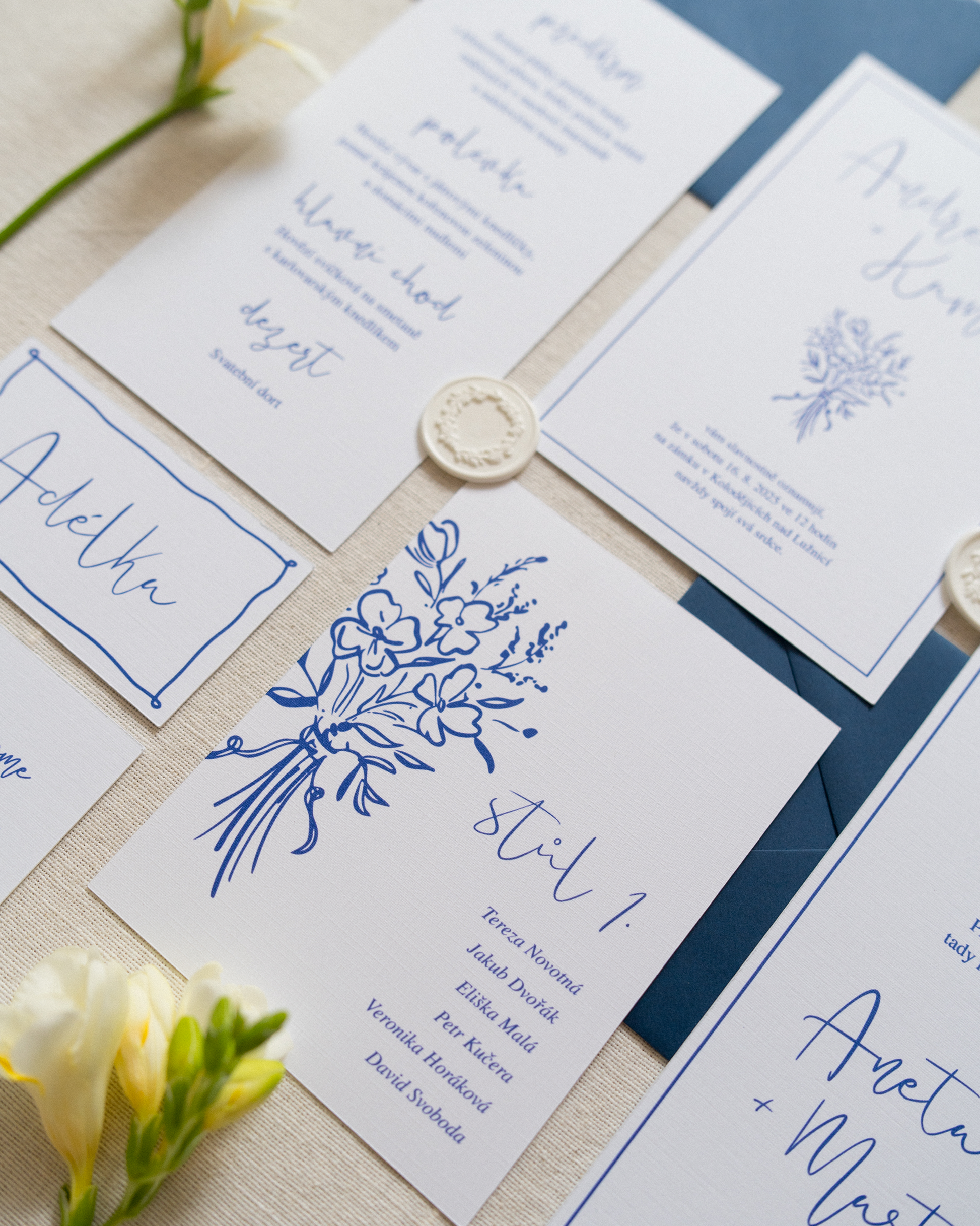 Jemná modrá a květinové ilustrace se v kolekci Mabel snoubí s elegancí a lehkostí venkova. Tato kolekce je ideální pro romantické svatby s přírodním, vintage nebo rustikálním nádechem – ať už se konají ve staré stodole, zahradě nebo v elegantní restauraci.