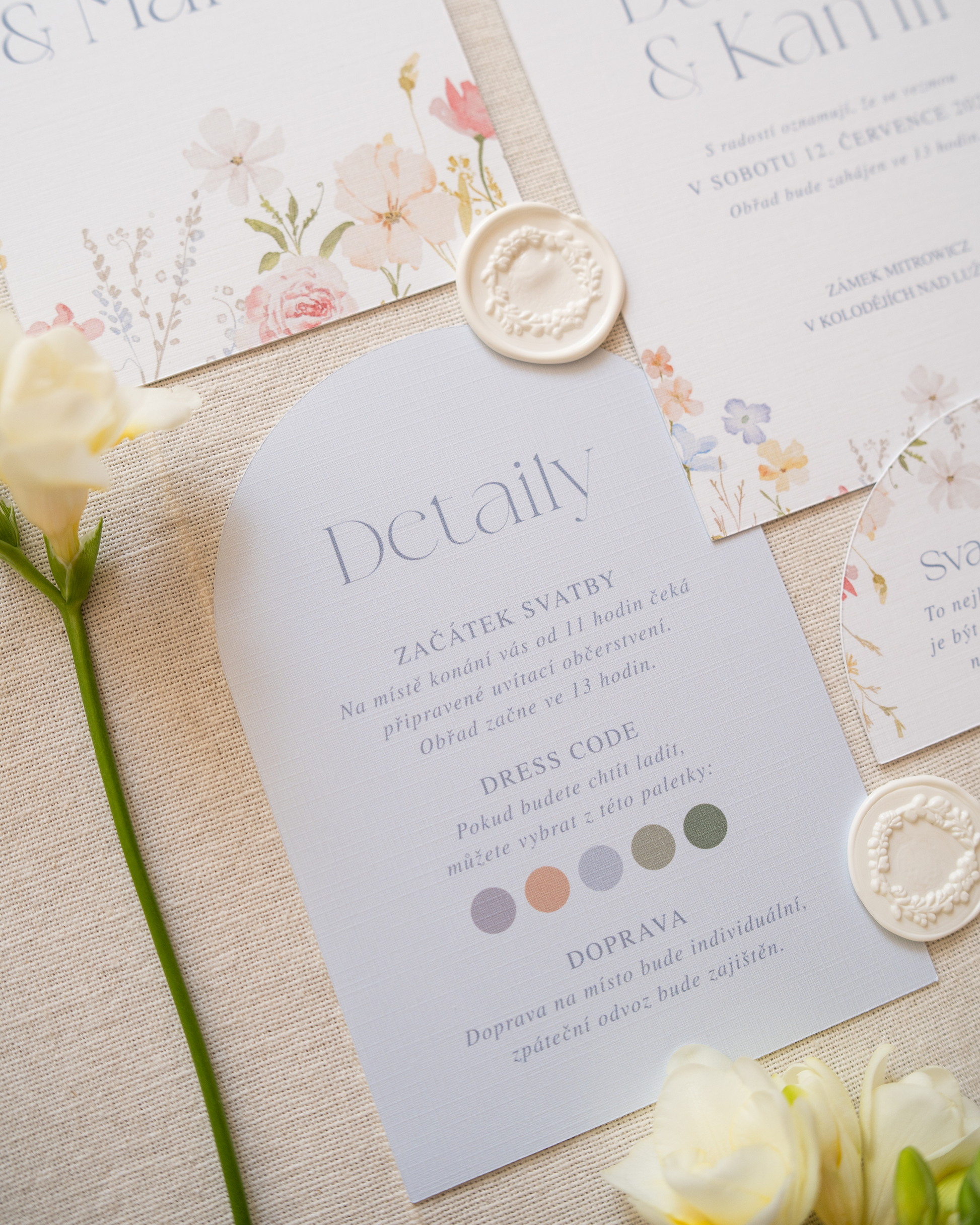 Kolekce Meadow je jako jarní ráno – jemná pastelová modř, drobné luční kvítí a klid, kdy se probouzí nový den. Přesně ten okamžik, kdy se budoucí nevěsta a ženich probudí s vědomím, že jejich den právě začíná. Tato kolekce je ideální pro svatby v přírodním či romantickém stylu. Kombinace pastelových tónů a květinových motivů působí lehce, svěže a nadčasově.
